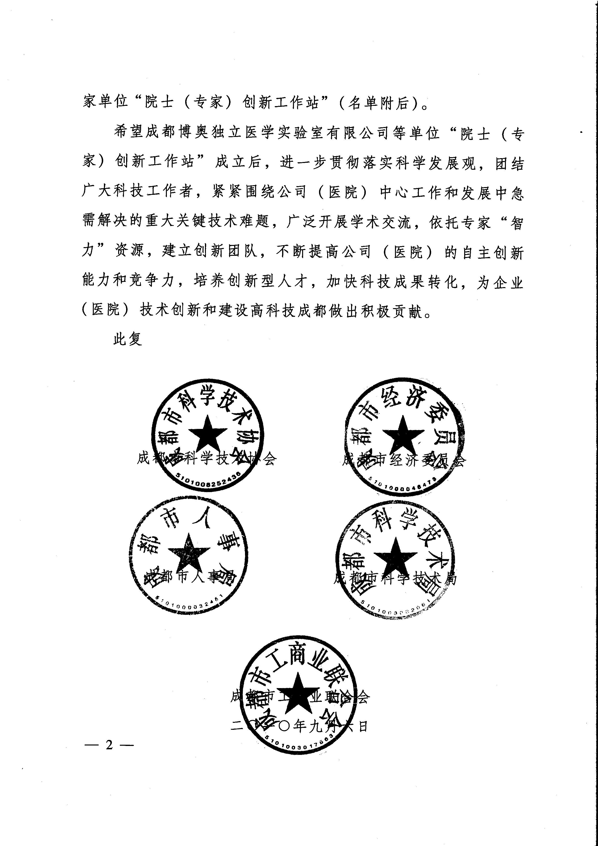 关于同意成立成都博身独立医学实验室有限公司等无机物“院士(专家)创新工作站”的批复