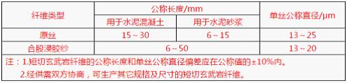 短切玄武岩纤维的规格和尺寸应符合表2.3.3的要求。