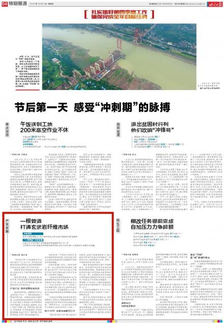 据介绍,给排水管铺开后,管道生产将由省内管道企业承担,航天拓鑫提供原料、技术。“除了管道,海洋海事工程网箱、清洁能源渔船、玄武岩纤维光伏支架等产品也在推进中。”曹柏青介绍,要让玄武岩纤维彰显自身优势,拓宽运用空间。