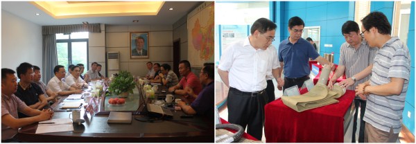 高浩孟一行详细了解了玄武岩纤维生产工艺及纤维制品、纤维复合材料、军贸配套产品的开发应用情况,以及玄武岩纤维产业现状和未来发展思路,并与公司总经理曹柏青就玄武岩纤维的产业应用及发展情况进行了交流。
