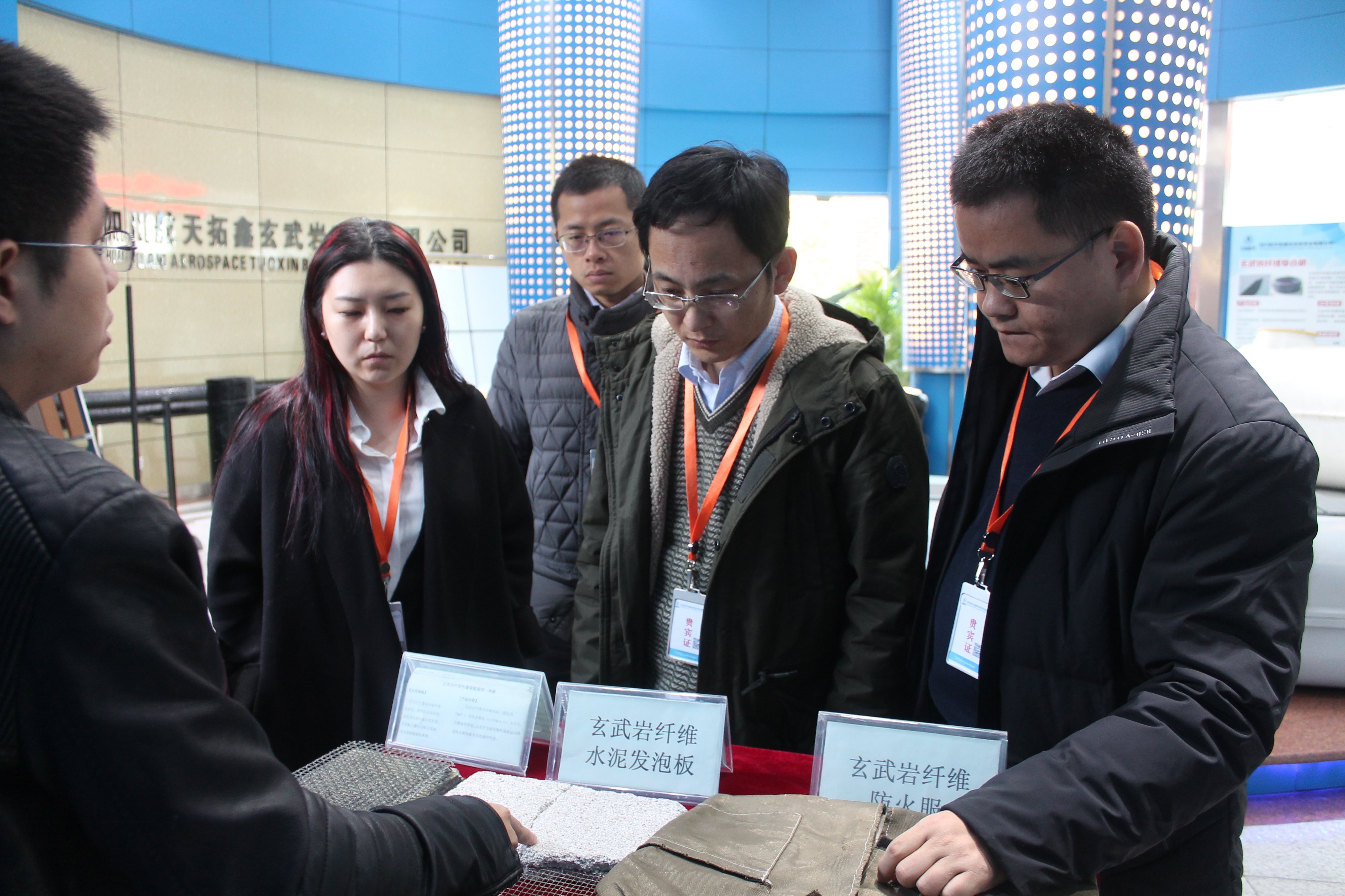产品开发应用工程师王孙富向来访客人详细介绍了航天拓鑫玄武岩纤维后制品及复合材料领域的研究