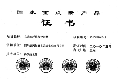 近日,由四川航天拓鑫玄武岩实业有限公司独立开发,拥有全部自主知识产权的“玄武岩纤维复合筋材”产品荣获由中华人民共和国科学技术部批准,国家环境保护部、国家商务部、国家质量监督检验检疫总局联合颁发的国家重点新产品证书。
