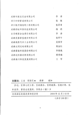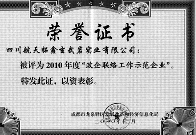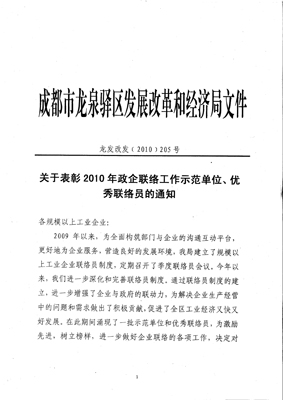 热烈祝贺我公司荣获成都市龙泉驿区发展改革和经济信息化局颁发的2010年度“政企联络工作示范企业”证书!