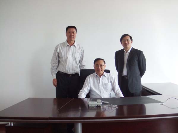 公司董事长张华(左一)、总经理曹柏青(右一)与杜院士(中)在公司院士工作站办公室合影