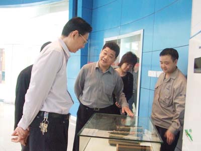 我公司副总经理杨彦斌(右一)陪同省经信委冶金建材处处长闫克俭(左一)等领导一行参观公司产品展示厅