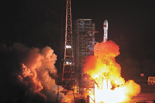 长征三号丙运载火箭托举天链一号02星在夜色中起程