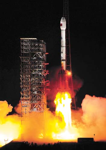 用于此次发射的长征三号乙运载火箭由一院研制。这次发射是长征系列运载火箭的第146次飞行。图为长征三号乙火箭在夜色中起飞。