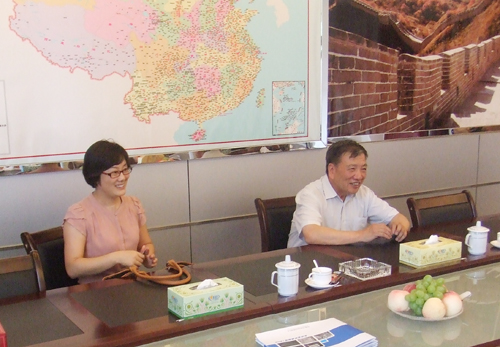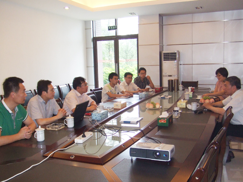 我公司曹柏青总经理(左三)、鲜平副总经理(左二)、董事会秘书赵世强(左一)陪同刘嘉麒院士(右一)考察并做会议交流