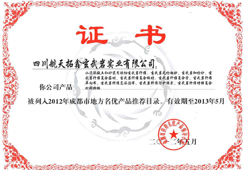 四川航天拓鑫玄武岩实业有限公司十一项产品(水泥混凝土和砂浆用短切玄武岩纤维、玄武岩无捻粗纱、玄武岩加捻纱、玄武岩纤维复合筋材、玄武岩纤维复合板材、玄武岩纤维复合管、玄武岩纤维单向布、玄武岩纤维高温滤布、玄武岩纤维防护绳索、玄武岩纤维增强复合材料格栅)被列入《2012年成都市地方名优产品推荐目录》。