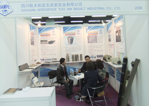 10月15~17日,SAMPE(国际先进材料与工艺技术学会)中国国际先进复合材料与工艺技术论坛暨展览会在北京举行。航天拓鑫参加了此次展会,并集中展出了玄武岩纤维后制品以建筑领域,复合材料领域,产业纺织品领域为主的(玄武岩高温滤袋,水泥短切纱,沥青用短切纱,玄武岩复合筋,玄武岩纤维复合材料,玄武岩纤维蜂窝板, 汽车帘子线,风力发电叶片等)高新后制品展示。