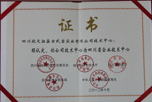四川航天拓鑫玄武岩实业有限公司荣获由四川省经济和信息化委员会、四川省科学技术厅、四川省财政厅、四川省地方税务局、中华人民共和国成都海关联合颁发的“四川省企业技术中心”证书及牌匾。