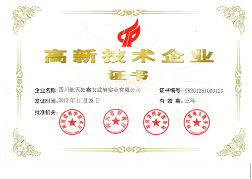 航天拓鑫于2008年被认定为玄武岩纤维行业首家高新技术企业,并取得相关主管部门颁发的《高新技术企业证书》。2012年公司通过了高新技术企业复审,并于2012年11月28日荣获四川省科学技术厅、四川省财政厅、四川省国家税务局、四川省地方税务局联合颁发的《高新技术企业证书》。