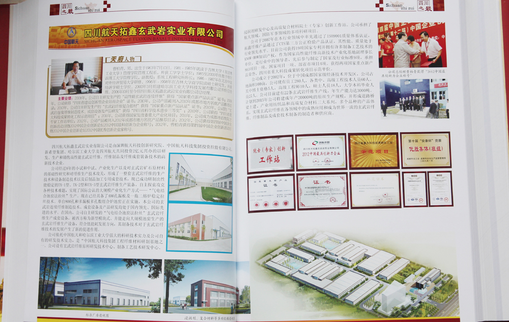 近日,由四川省政府国有资产监督管理委员会、四川省发展改革委员会、四川省经济和信息委员会、四川省统计局四家部门联合举办的首届“四川之最”评价宣传活动揭晓,四川航天拓鑫玄武岩实业有限公司荣编首届“四川之最”大型宣传画册。