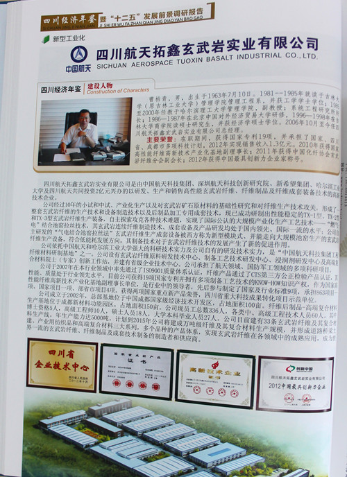近日,四川航天拓鑫玄武岩实业有限公司荣编由四川省统计局、四川省发展和改革委员会、四川省经济和信息化委员会、四川省住房和城乡建设厅、四川省交通运输厅共同组织编辑的首部《四川经济年鉴(2013)》。