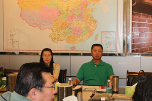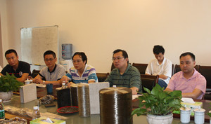 四川航天拓鑫玄武岩实业有限公司总经理曹柏青(右起二)、副总经理鲜平(中)、副总经理杨彦斌(右起一)、董事会秘书赵世强(左起一)、生产总监陈建华(左起二)出席会议